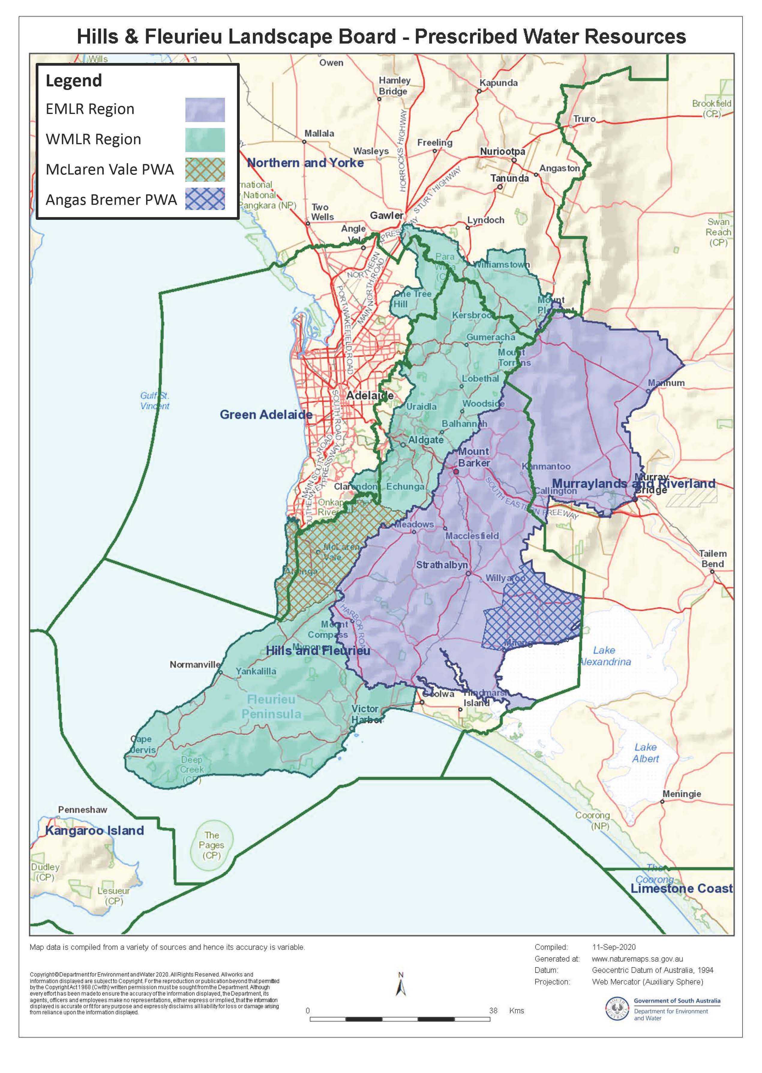 The Eastern Mount Lofty Ranges Prescribed Water Resource Area is predominantly within the Hills and Fleurieu region, with a smaller part in the Murraylands and Riverland region.